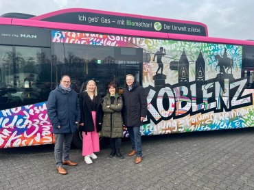 Heute geht der erste Koblenzer Urban Art-Bus in den Linienbetrieb. Ab sofort können Fahrgäste in das Kunstwerk von Franziska Diekel einsteigen, die mit ihrem Entwurf den koveb Urban Art Wettbewerb gewonnen hat. Das prämierte Design, das die Elemente der Koblenzer Stadt-Silhouette mit leuchtenden Farben und Schrift kombiniert, wird für zwei Jahre täglich durch Koblenz fahren.